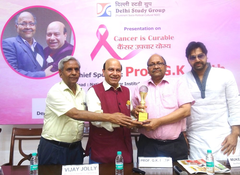 Prominent socio- political- cultural NGO, Delhi Study Group led by Ex. Delhi MLA & President Vijay Jolly felicitated & honored Prof. G.K. Rath, Cancer Chief AIIMS (All India Institute of Medical Sciences) for pioneer research in curing cancer in India. Prof. G.K. Rath was honored with a shawl, citation & trophy by Delhi Study Group at a crowded program at Constitution Club, New Delhi. The Convener of the program Prof. Ashok Sharma is research scholar AIIMS & Secretary Delhi Study Group.