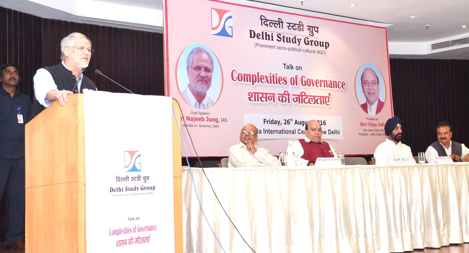 नई दिल्ली, 26 अगस्त, 2016: दिल्ली स्ट्डी ग्र्रुप (प्रमुख गैर सरकारी संगठन) अध्यक्ष व पूर्व दिल्ली विधायक विजय जौली की अगुवाई में ‘‘शासन की जटिलताओं’’ विषय पर सार्वजनिक कार्यक्रम नई दिल्ली लोधी रोड स्थित इण्डिया इंटरनेशन सेंटर में आयोजित किया गया।