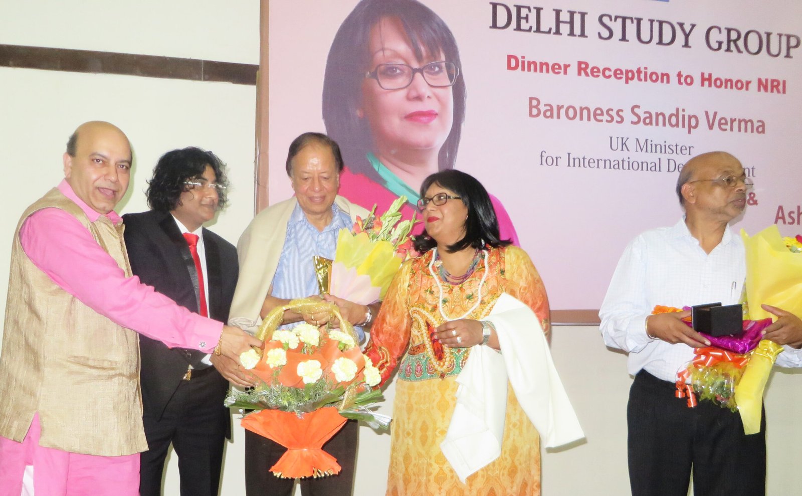 New Delhi, 31st Aug 2015 : Delhi Study Group (prominent socio- political –cultural NGO) led by President Vijay Jolly & Ex. Delhi BJP MLA felicitated UK Minister for Int’l Development Baroness Sandip Verma at a public program in New Delhi. Also honored were her husband Ashok K. Verma, Chairman NRI Foundation in UK. The co-host along with Mr. Jolly was Lion Ram Gopal Goyal of Lions Club International.