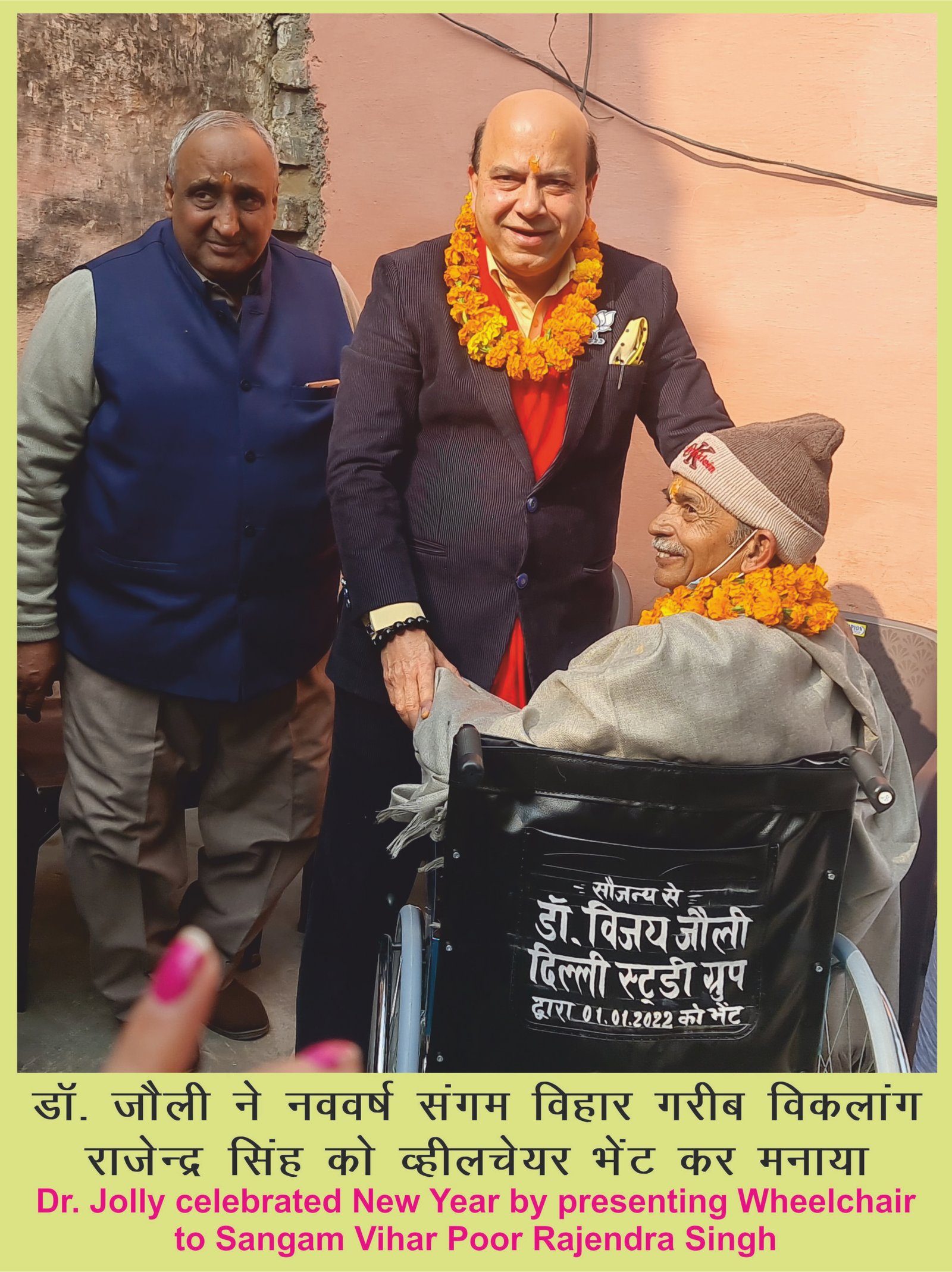 पूर्व भाजपा ‘‘संगम विहार-देवली विधायक’’ व दिल्ली स्ट्डी ग्रुप (गैर सरकारी संस्था) अध्यक्ष डॉ. विजय जौली ने विकलांग राजेंद्र कुमार की दयनीय हालात देखते हुए, आज नववर्ष के पहले दिन, उनके निवासः एल-1, म.नं0 2126, गली नं0 10, संगम विहार, नई दिल्ली-80 पर जा कर, उन्हें एक स्टील की व्हीलचेर भेंट की। इससे राजेन्द्र कुमार के चेहरे पर खुशी के ऑसू व मुस्कान आज देखने को मिली।