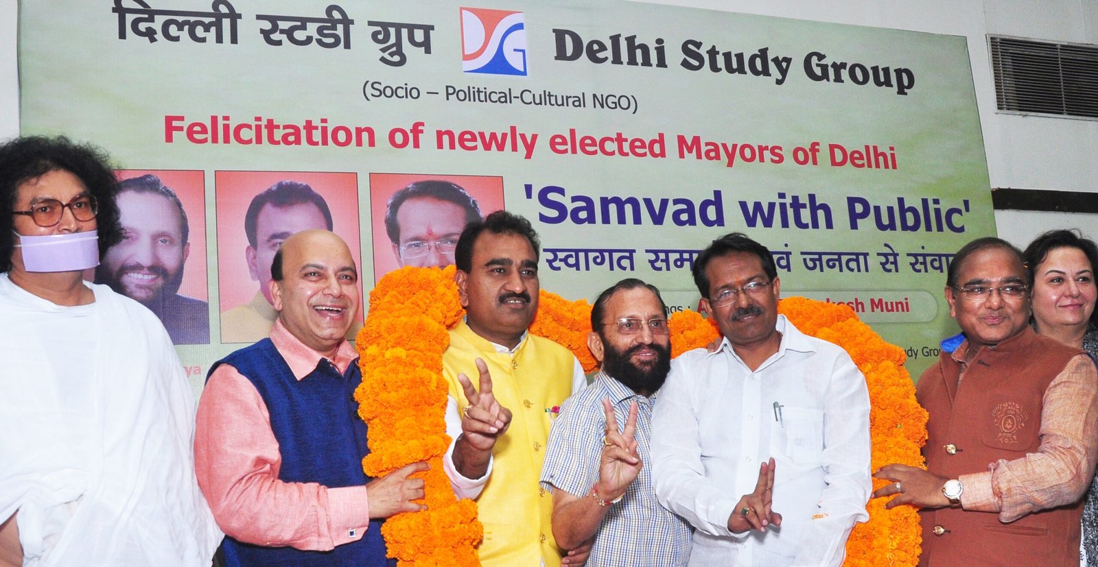 New Delhi, 13th May 2015 : Delhi Study Group (prominent socio–political–cultural) NGO led by Ex. MLA & President Vijay Jolly today organized a public program to honor all three newly elected Mayors of Delhi. Flower bouquets & momentous were presented to Subhash Arya (South Delhi Mayor), Ravinder Gupta (North Delhi Mayor) & Harsh Deep Malhotra (East Delhi Mayor). Famous Jain Saint Acharya Dr. Lokesh Muni blessed the gathering. PHDCC President Media Committee Mukesh Gupta presented a big garland to all the three Mayors. Prominent businessman Suraj Bindal, Managing Director Suraj Industries Ltd. graced the occasion as Chairman Reception Committee. Saint Shri Shri Manmohan Brijwasi (Varindavan wale) & Delhi Sikh Gurdwara Prabandhak Committee Gen. Sec. Sardar Manjinder Singh Sirsa also spoke on the occasion. Prominent Delhi Study Group members namely Ritu Rathaur, Kavita Ashok & Himanshi Pandey read the achievements of all the Mayors. The program was conducted by Vice President Bhupinder Kansil. Delhi Study Group patrons Pinky Anand (Addl. Solicitor General of India) & Member of Parliament Pravesh Verma also graced the occasion. A lively dialogue (Samvad) with public (Janata) was also conducted with the public in attendance.