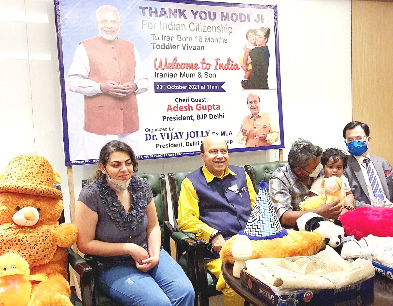 New Delhi, 23rd Oct 2021: Senior Indian BJP Leader Dr. Vijay Jolly organized a welcome program "Thank You PM Modi ji" for granting Indian Citizenship to Iran born 16 months toddler 'Vivaan' Sharma. Iranian mother Romina Zeinali Esmaeilabad along with her Iran born son, out of her wed lock with Indian citizen Ved Prakash Sharma, arrived into India by Mahan Airline flight from Tehran late yesterday night.